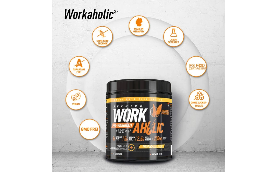 WORKAHOLIC® ist eine leistungsstarke, clever zusammengesetzte Pre-Workout Formula für intensive Trainingseinheiten – hergestellt aus den 20 besten Zutaten mit maximalem Synergie-Effekt.