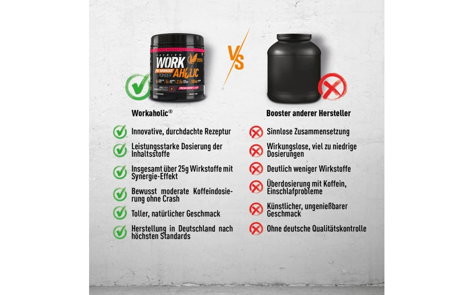 Nicht nur bei Zutaten und Dosierung, sondern auch im direkten Vergleich punktet der Workaholic® Booster.