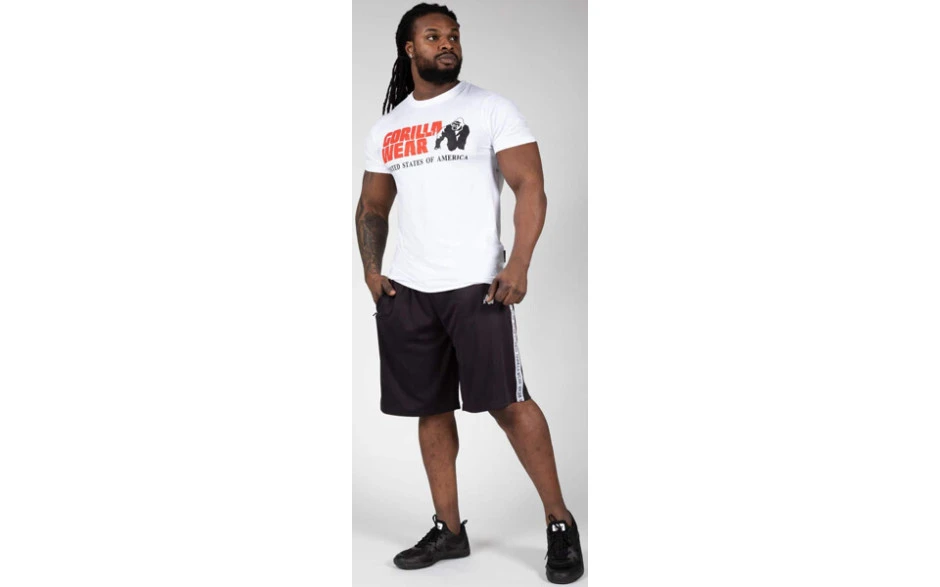 Gorilla Wear setzt auf Kontraste, die bei dieser Shorts einmal mehr deutlich werden. Schwarz passt als Farbe einfach zu jedem Schuh und Oberteil, weshalb du mit dieser kurzen Hose nichts falsch machen kannst. Die weißen Streifen an der Seite – kombiniert mit dem Print von Gorilla Wear – fallen dabei sofort ins Auge. Dazu das weiße Logo des Herstellers, das sich unter der linken Tasche befindet.