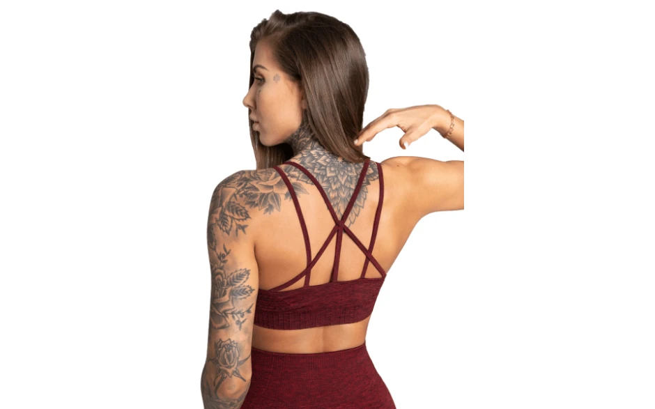 Im Brustbereich wir er duch Push-Up und mit einem festen Halt gestützt. Zu beachten und auch ein Hingucker ist das schöne Logo im Brustbereich der Firma Gym Glamour. Dieses fällt bei der Farbe Burgund-Melange besonders auf.
