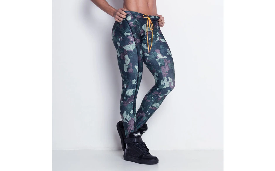 Leggings im Military Look sind total angesagt. Dies sieht LabellaMafia auch so und hat für fitnessbegeisterte Ladys noch eine Leggings im Military Look designed und produziert. Sie ist durch den knallig orangenen Kordelzug natürlich ein echter Blickfang. Dieser fällt einem direkt ins Auge. Für das coole Camo Muster wurden wirklich schöne Farben verwenden. Es wurden verschiedene Grüntönen und ein Braunton verwendet. Das Besondere an dem Muster ist, dass es durch verschiedene Schattierungen bzw. künstlerische Striche ein steinartiges Muster erhält.