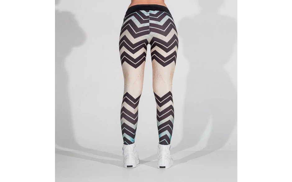 Die größte Fläche der Leggings zeigt sich in einem schönen Beigeton und verläuft sich nach unten und oben in eine Art von Türkis. Unterbrochen wird dieser Verlauf durch coole, groß gezackte, schwarze Streifen, die sich einmal unter dem Knie bis zum Knöchel und auch nochmal über dem Knie bis hoch zum Becken verteilen und somit der modernen Leggings von LaBellaMafia die Verspieltheit und das gewisse Etwas verleihen.